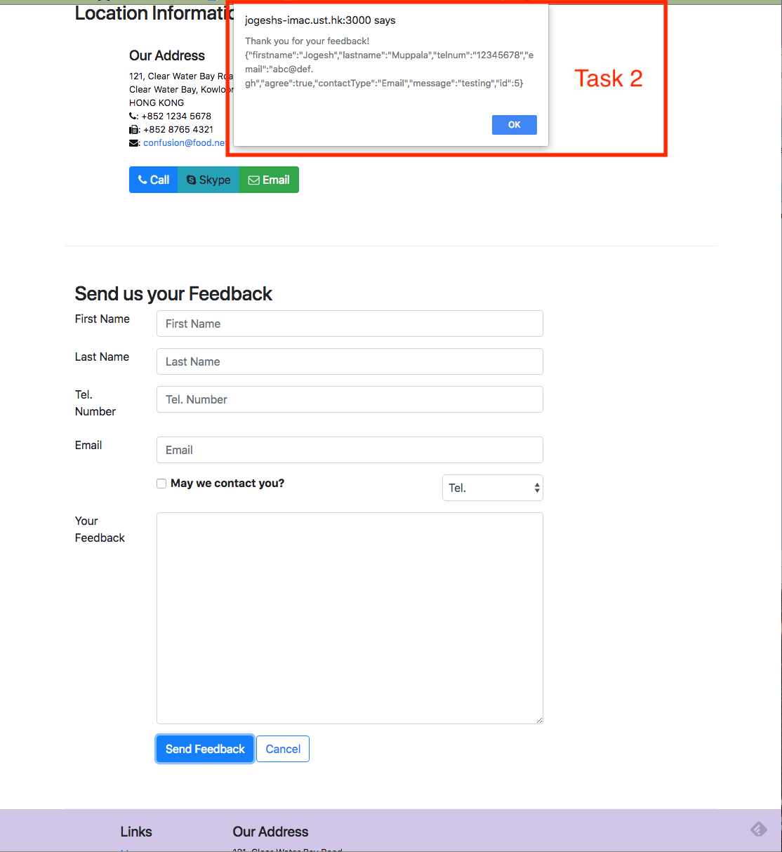 In this task, you will enable the saving of the feedback data submitted using the feedback form in the Contact component. You will save the feedback form data submitted by the user to the server:
