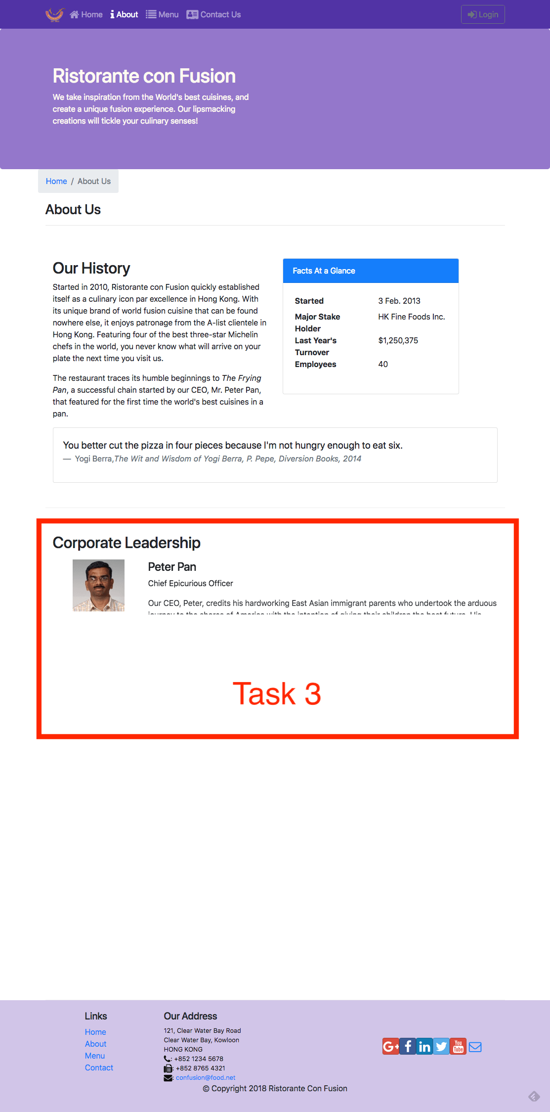 In this assignment, you will update the web application to get data from the server to render the information corresponding to the leadership team of the company. In addition, you will handle the submission of the feedback form by posting the feedback to the server.